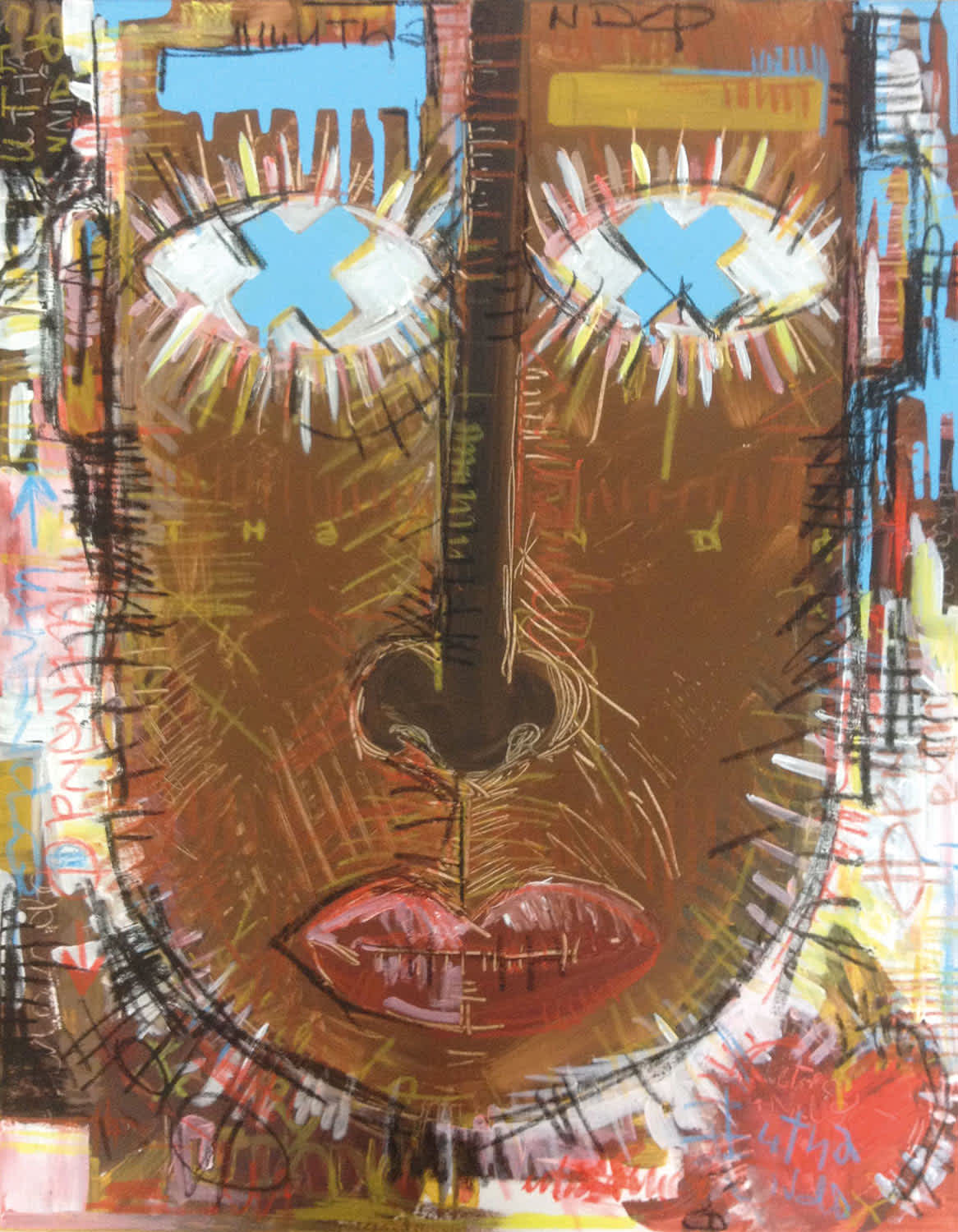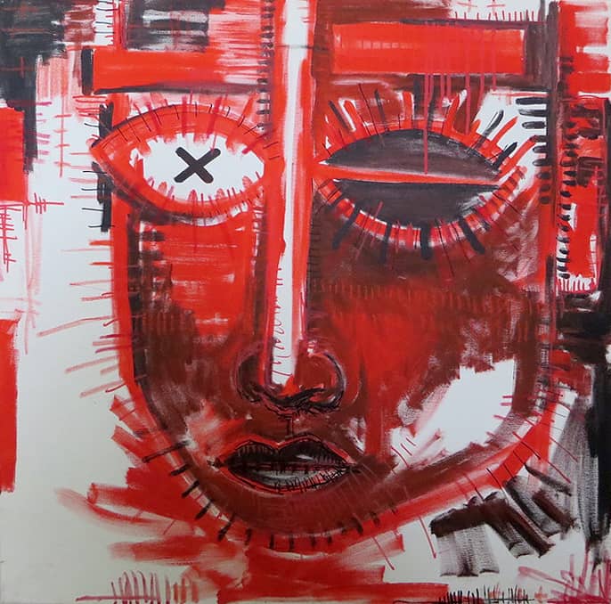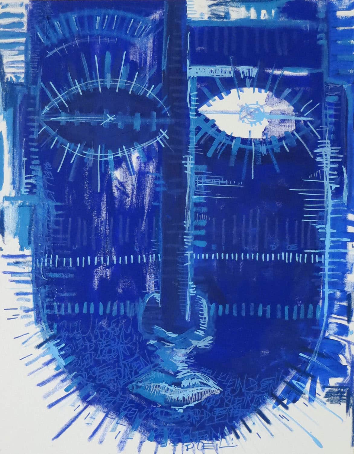 Bercé, influencé par l’ambiance artistique familiale, {nikonografik} montre un intérêt précoce pour le support imagé. A l’adolescence, vient le temps de la découverte du hip hop et des formes artistiques liées au mouvement : le graff, le tag et les mots qui créent du sens. Du graff reste son goût pour la composition et la couleur. De la musique naît l’amour des mots. La poésie s’en mêle : “Encore des mots, toujours des mots…” {nikonografik} multiplie les expérimentations artistiques : dessin, tag, graff, peinture, linogravure, numérique, sérigraphie, collage… Avec ses portraits, l’artiste n’en fait qu’à ses têtes : spontanéité, couleurs vives, regards francs, regards croisés… Un travail sur ce qui est une de ses obsessions depuis quelques temps : la tête. La tête, c’est à la fois le dehors/le dedans, le visible/l’invisible, l’ombre/la lumière… Il y a matière à voir, matière à lire, car les mots sont bien présents, quasi indispensables et indissociables de son travail. On regarde, on se laisse regarder… Une forme de prise de tête mise en forme de manière poétique et graphique. Il traite ses portraits en ajoutant des couches, en retirant de la matière, en griffant, en écrivant, en barrant, en hachurant… comme pour donner vie aux “vie-sages” (ou pas), comme pour évoquer le vécu. On lit dans les lignes de vie, dans les lignes de… l’humain. Une technique intrinsèquement liée à la démarche qui nous révèle les pensées d’un humaniste.